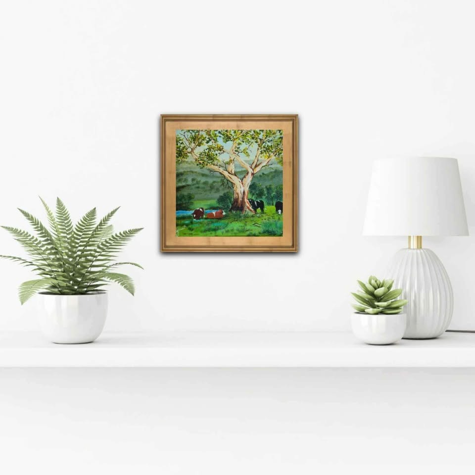 Gumtree on Hill hand painted acrylics on canvas panel 30.5 x 30.5 finished by atelier varnish , frames for display only
