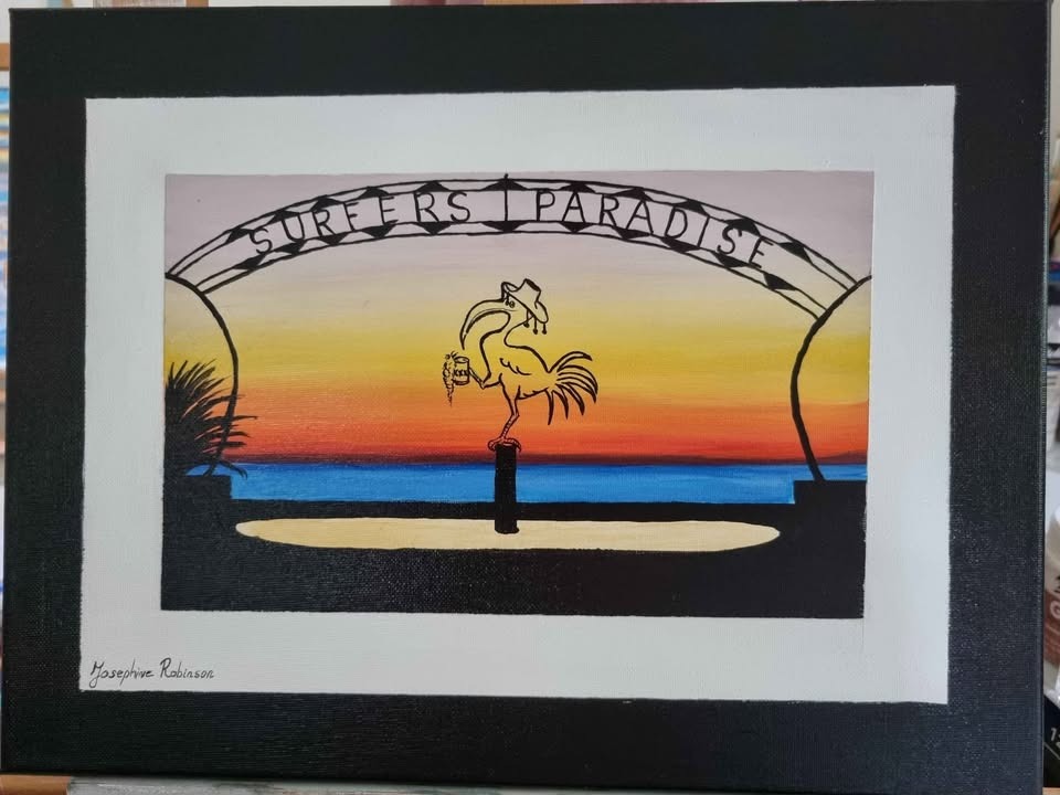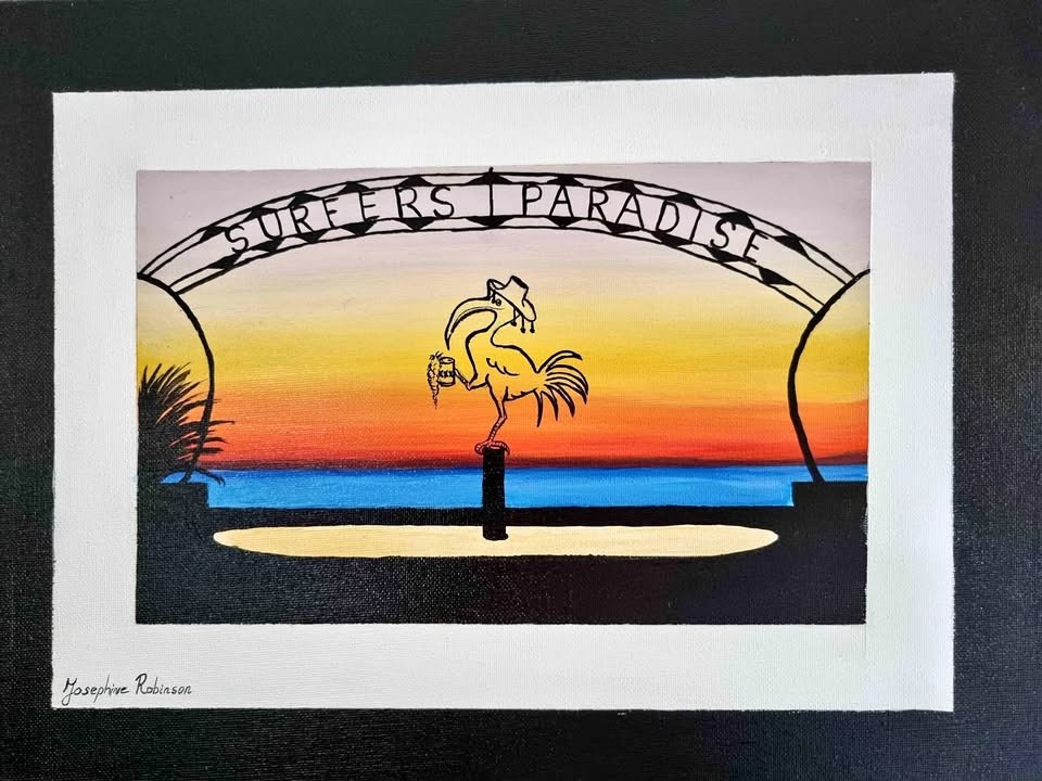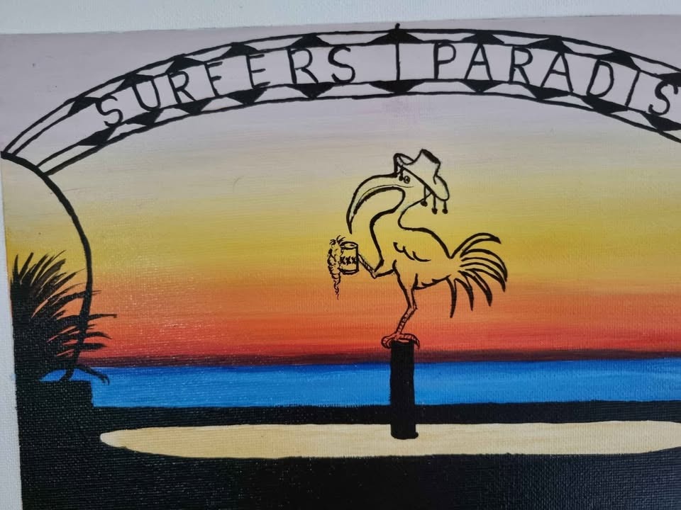 Acrylic painting captures the charm of surfers paradise and the funny iconic bin chicken